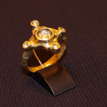Bague en laiton sertie d'une perle de culture et de 4 pierres semi-précieuse (grenat, corail, améthyste). Il est également possible de remplacer la perle centrale par une pierre semi-précieuse. Bague provenant des fouilles de la ville d'York au Royaume Uni. Possibilité d'autres métaux et pierres sur demande.